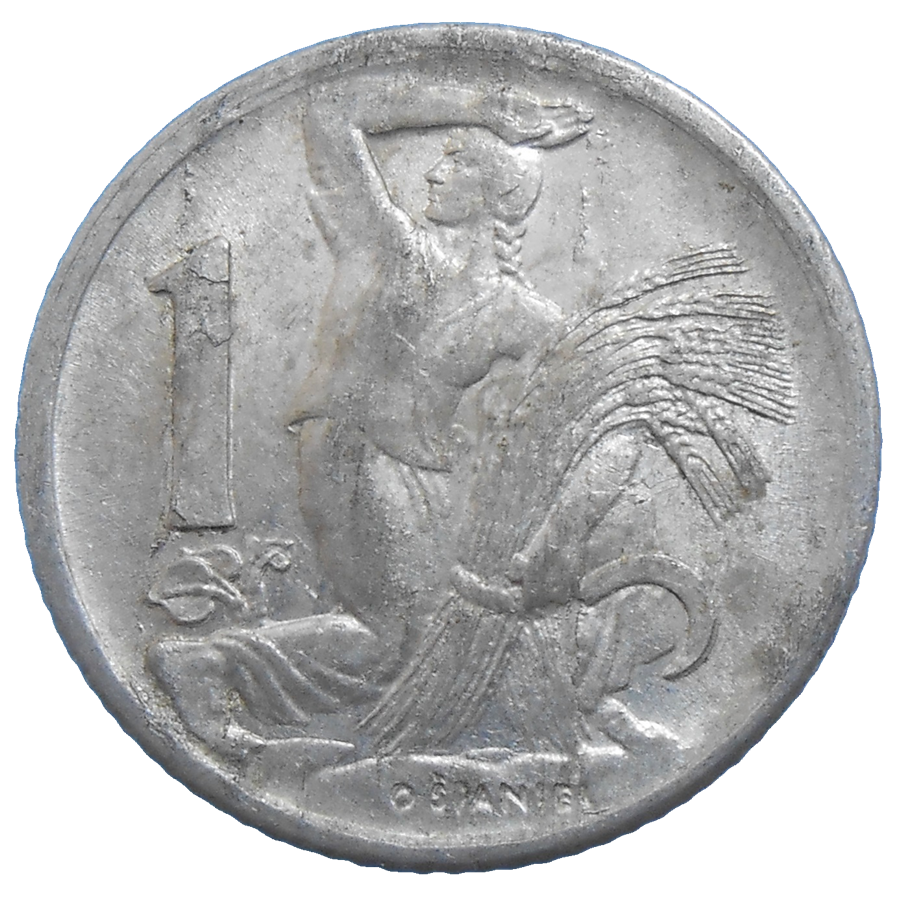 Stará, hliníková, obehová minca Československa v hodnote 1 Koruny z roku 1951.