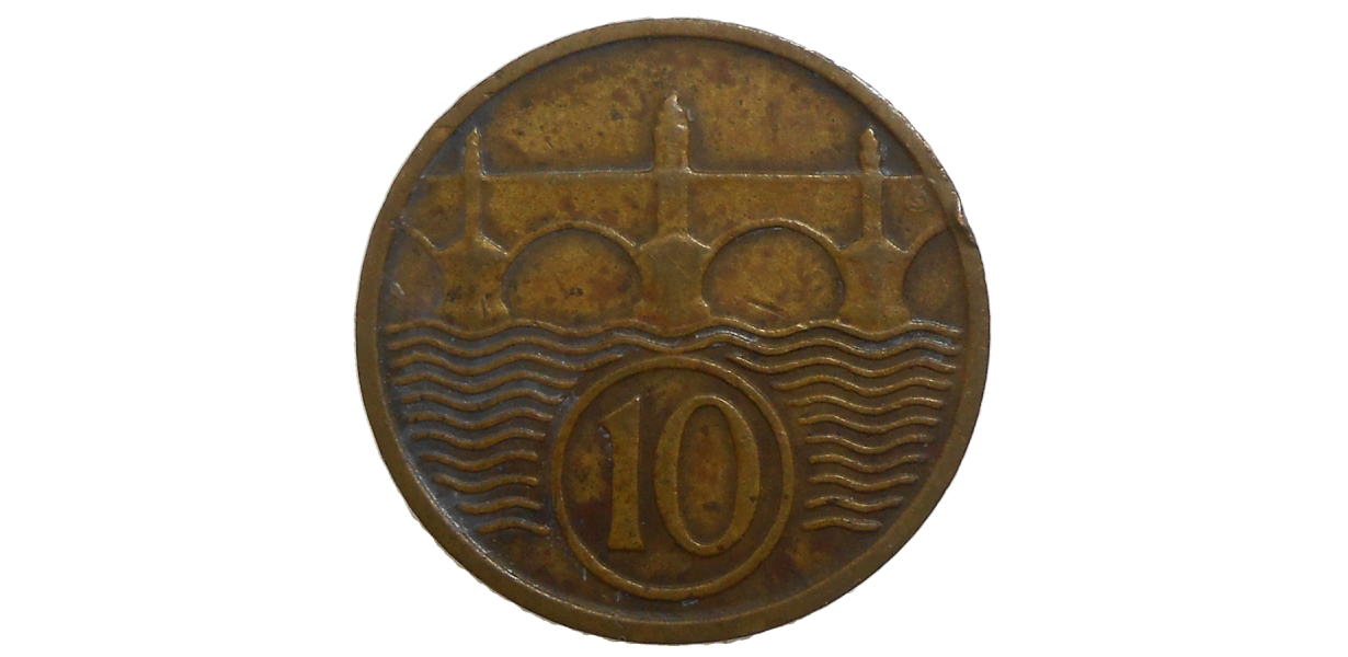 Stará, bronzová, obehová minca Československa v hodnote 10 Halierov z roku 1936.