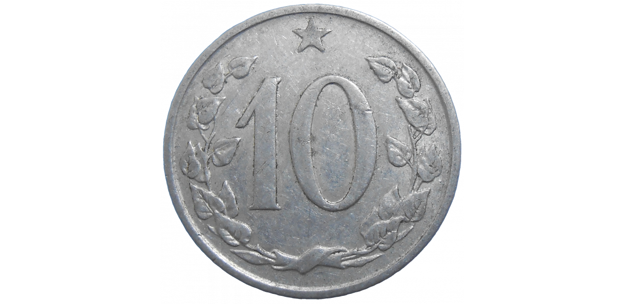 Stará, hliníková, obehová minca Československa v hodnote 10 Halierov z roku 1966.