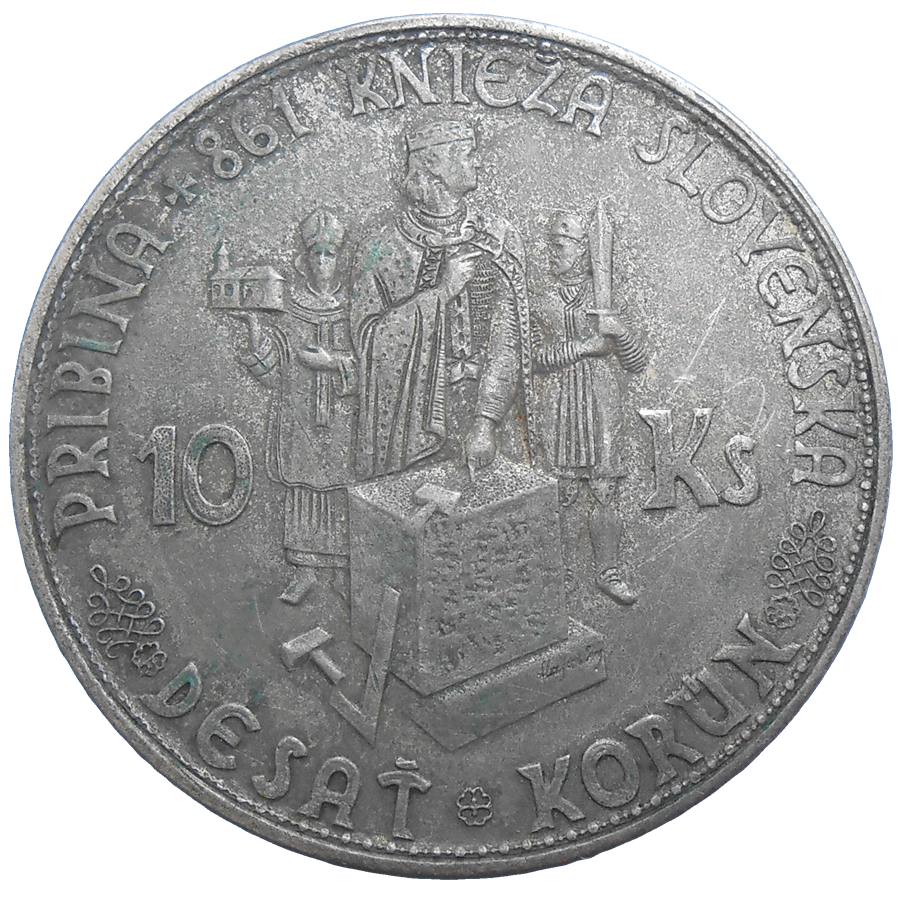 Stará, strieborná, obehová minca Slovenského Štátu v hodnote 10 Korún z roku 1944.