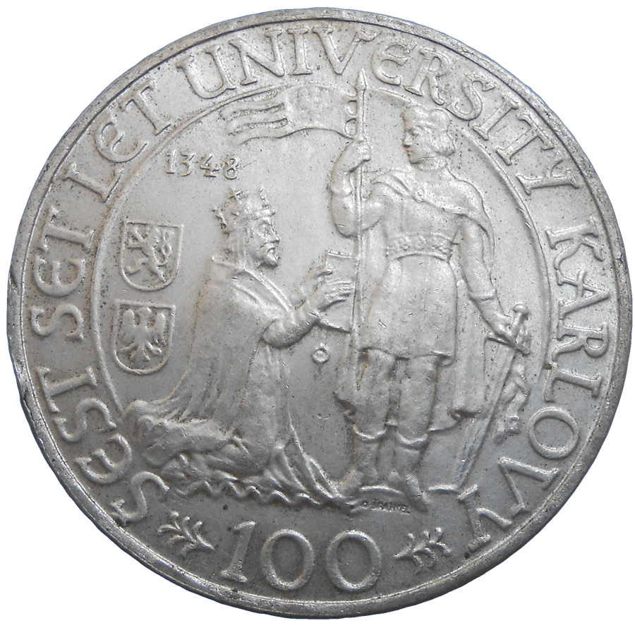 Strieborná, pamätná minca Československa v hodnote 100 Korún z roku 1948, vydaná pri príležitosti 600. výročia založenia Karlovej Univerzity.