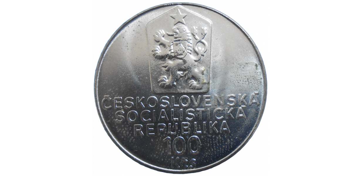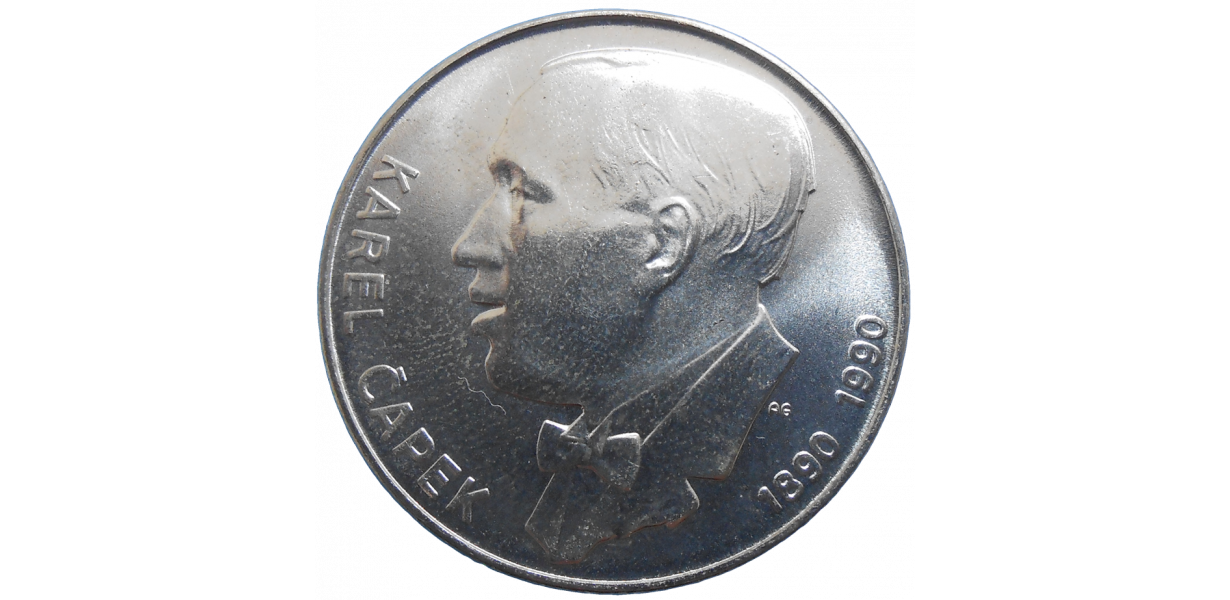 Strieborná, pamätná minca Československa v hodnote 100 Korún z roku 1990 vyrazená pri príležitosti 100. výročia narodenia Karla Čapka.