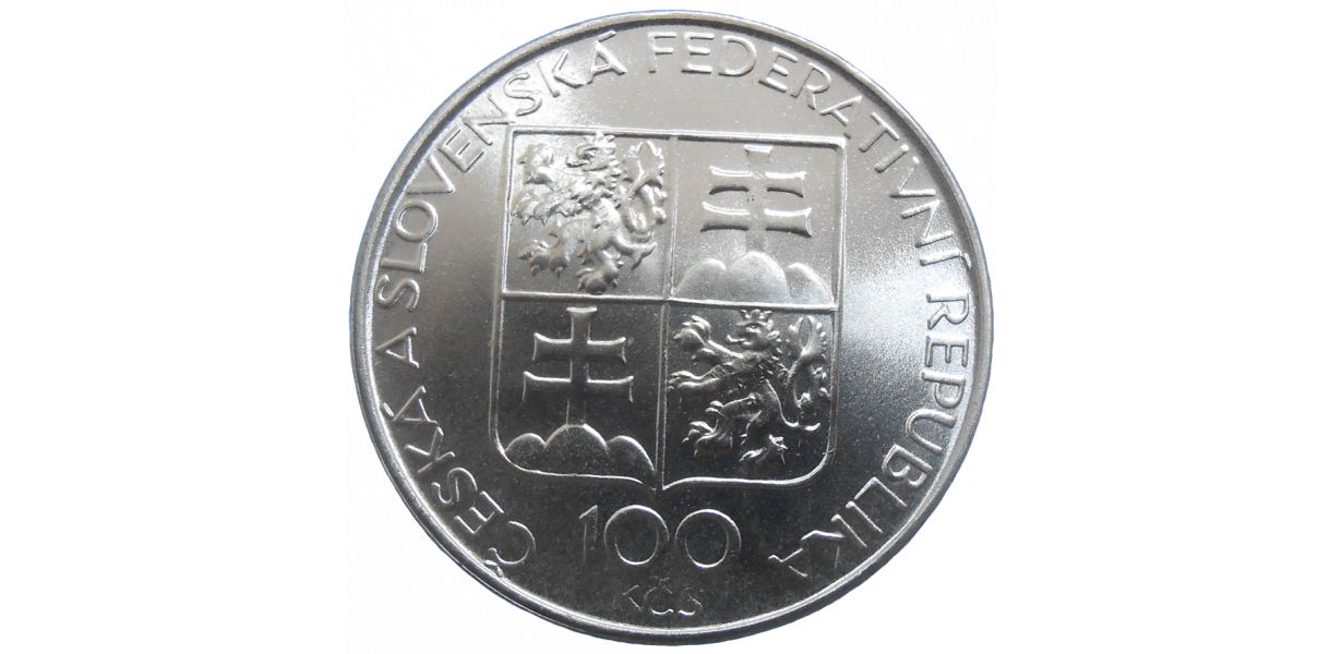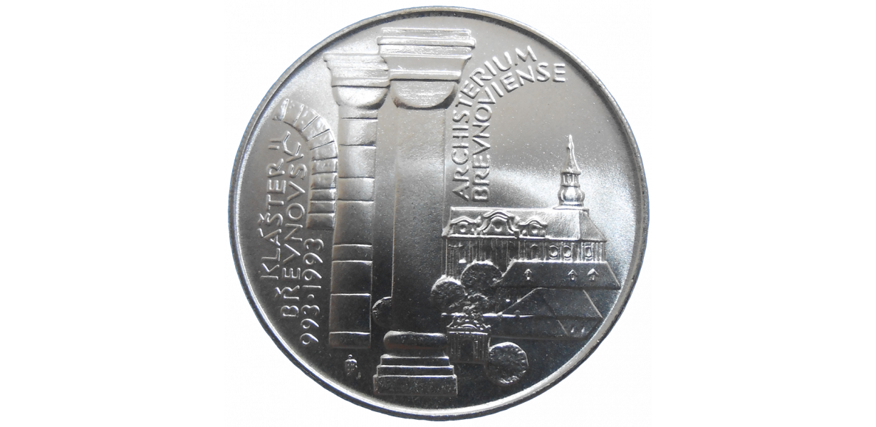 Strieborná, pamätná minca Československa v hodnote 100 Korún z roku 1993, vydaná pri príležitosti 1000. výročia založenia Břevnovského Klaštora.