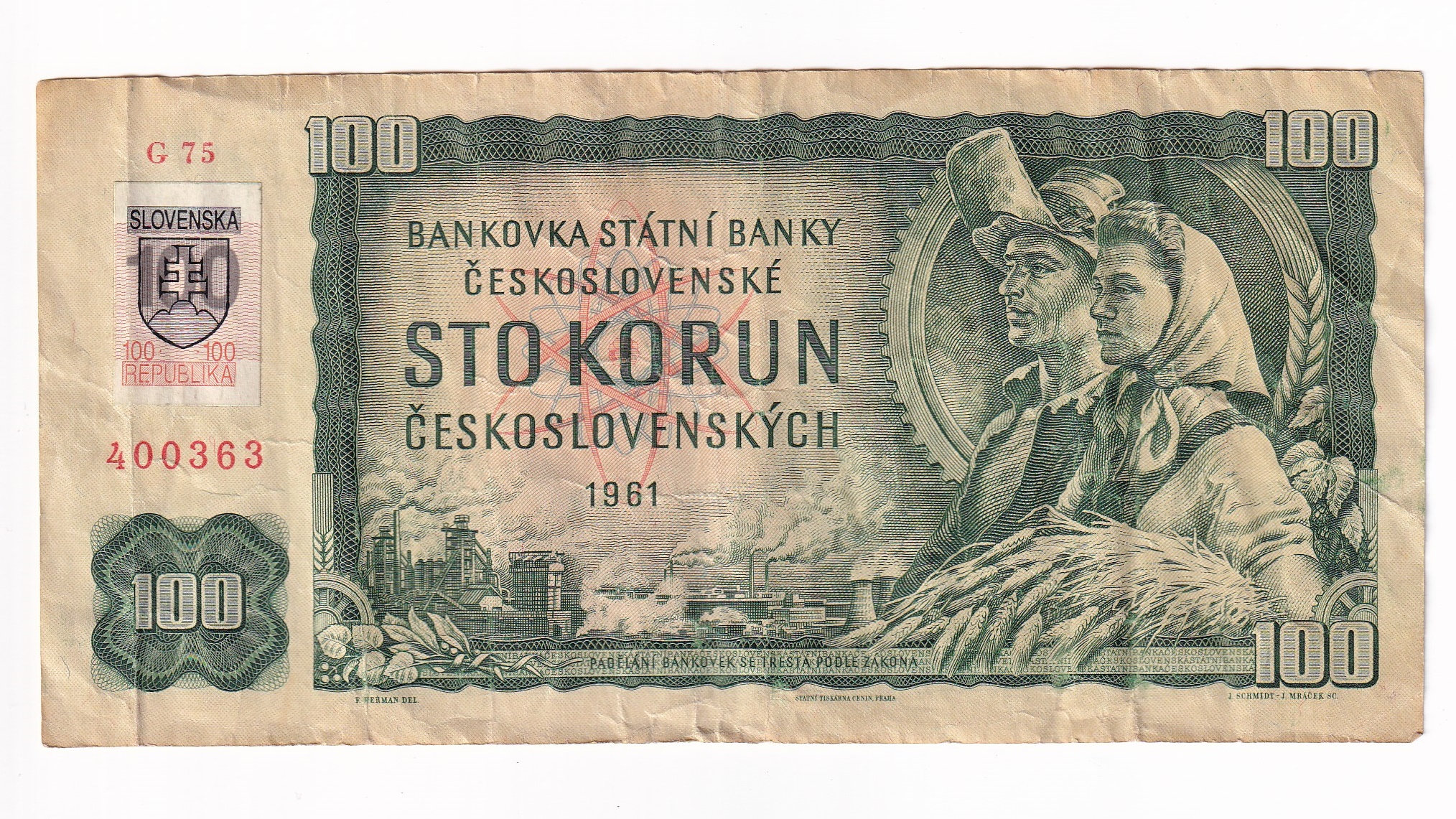 Stará, obehová bankovka Československa v hodnote 100 korún z roku 1961 so slovenským kolkom.