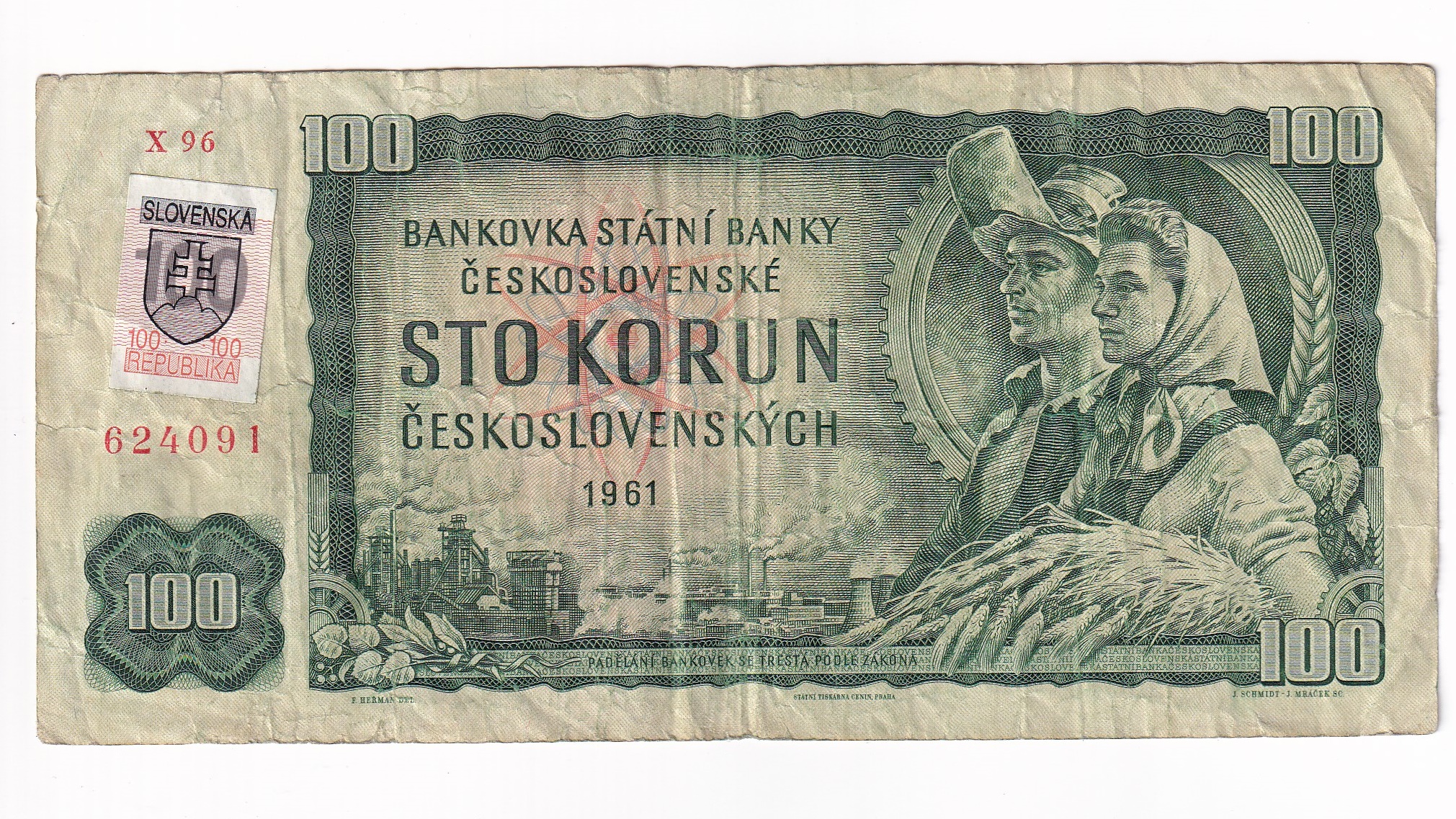 Stará, obehová bankovka Československa v hodnote 100 korún z roku 1961 so slovenským kolkom