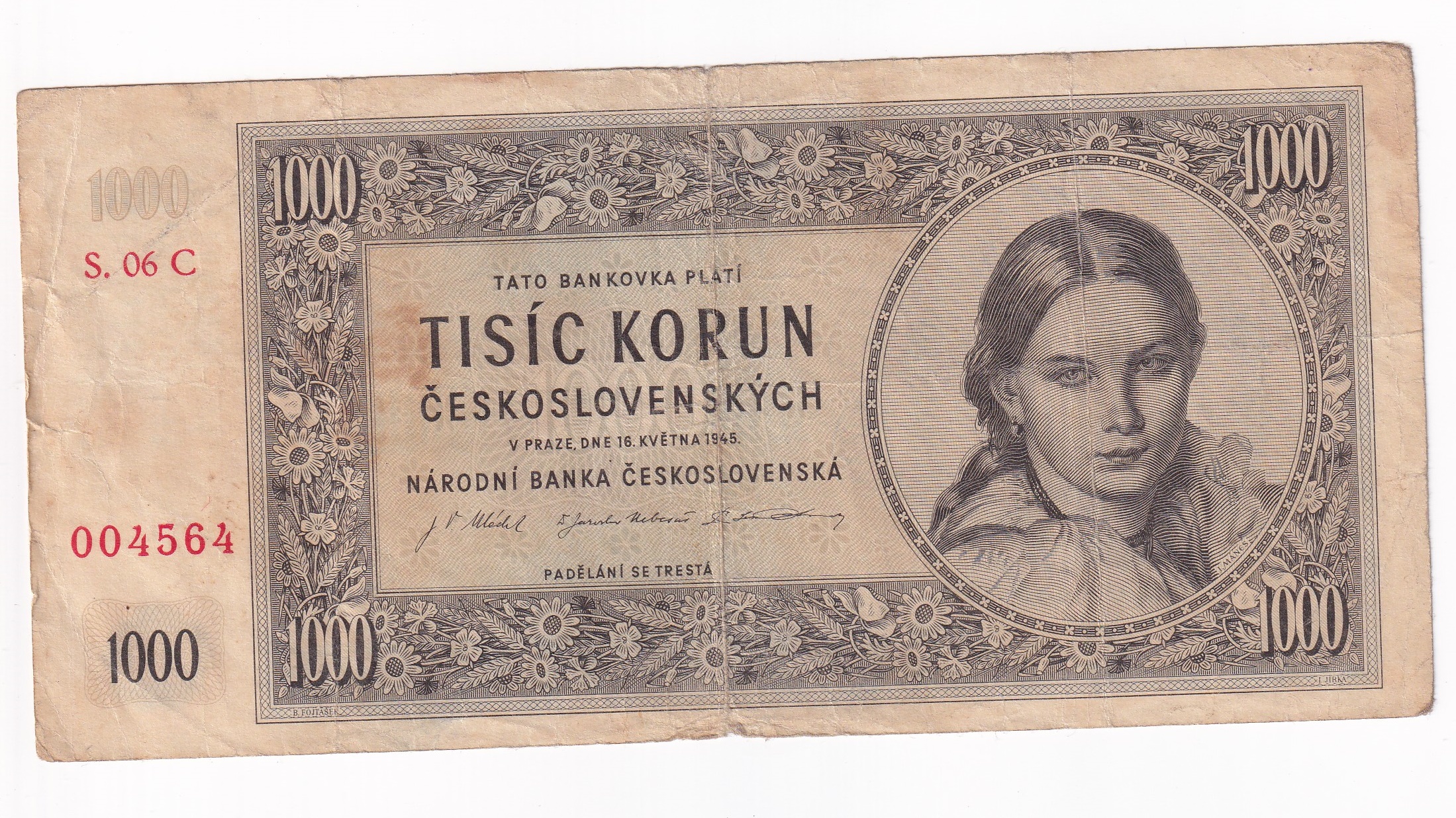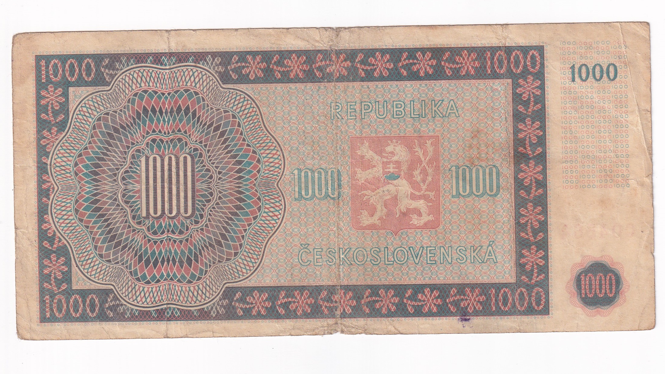 Stará, obehová bankovka Československa v hodnote 1000 Korún z roku 1945.