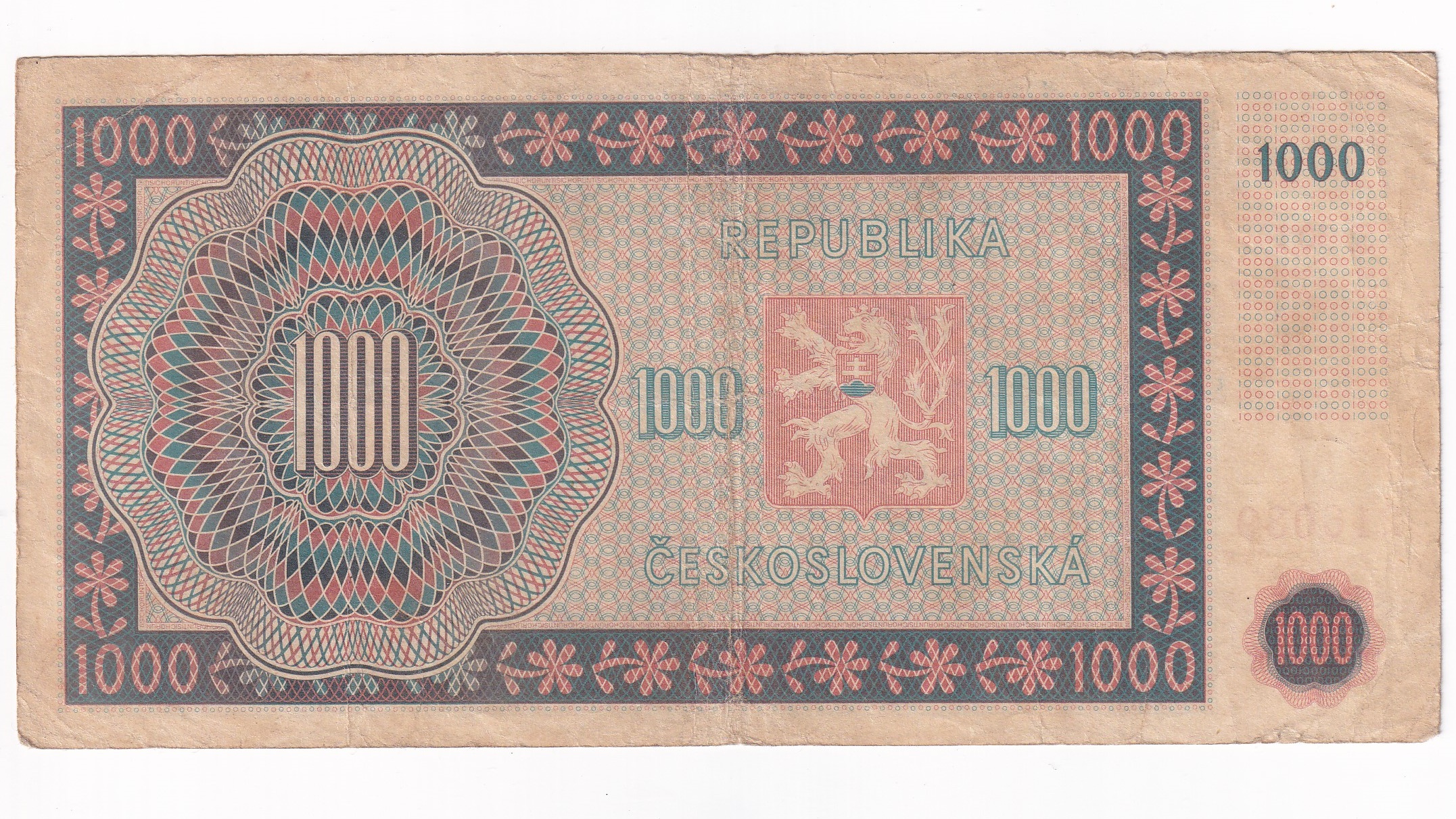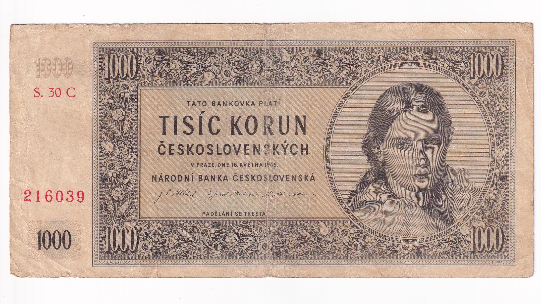 Stará, obehová bankovka Československa v hodnote 1000 Korún z roku 1945.