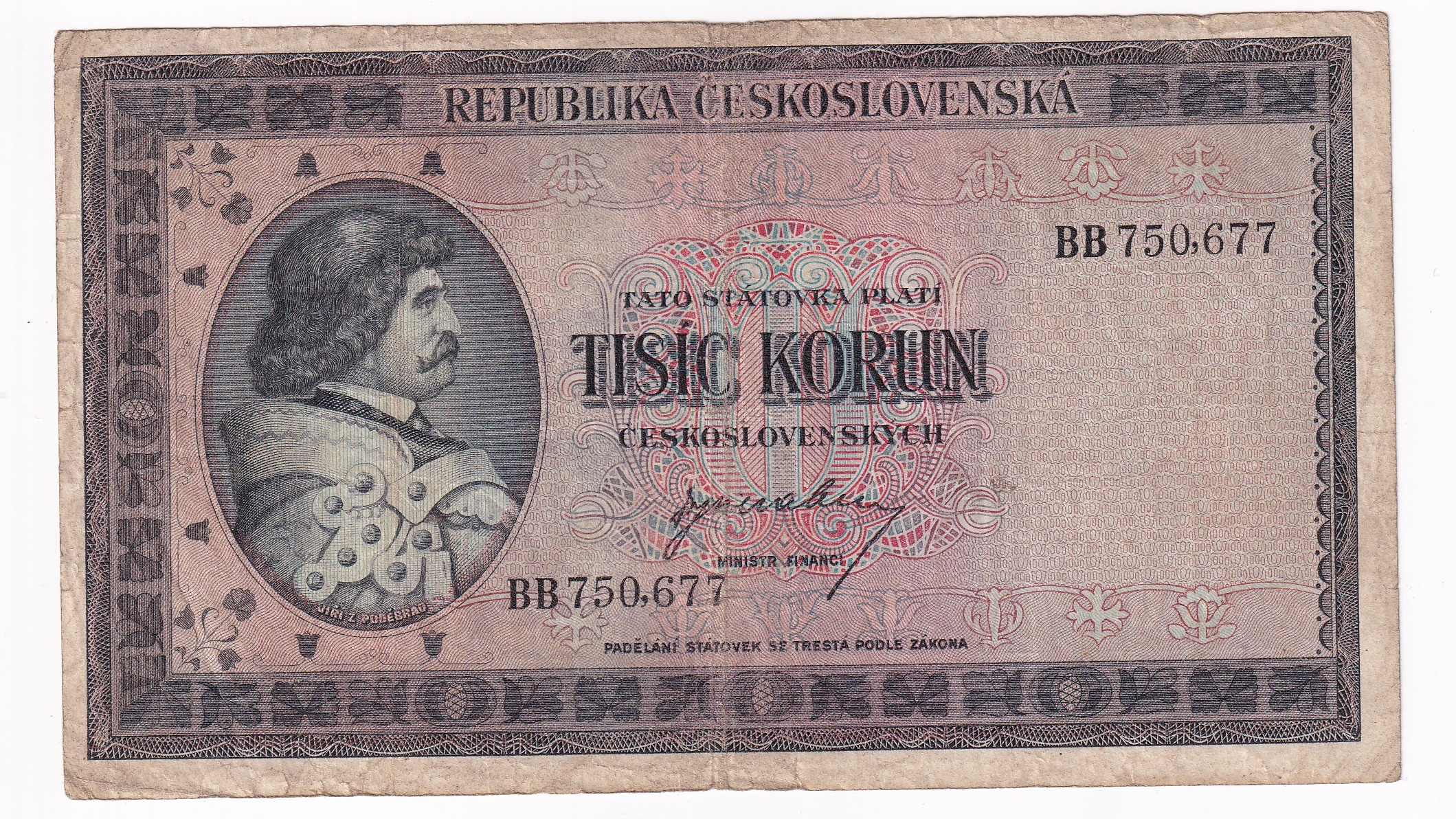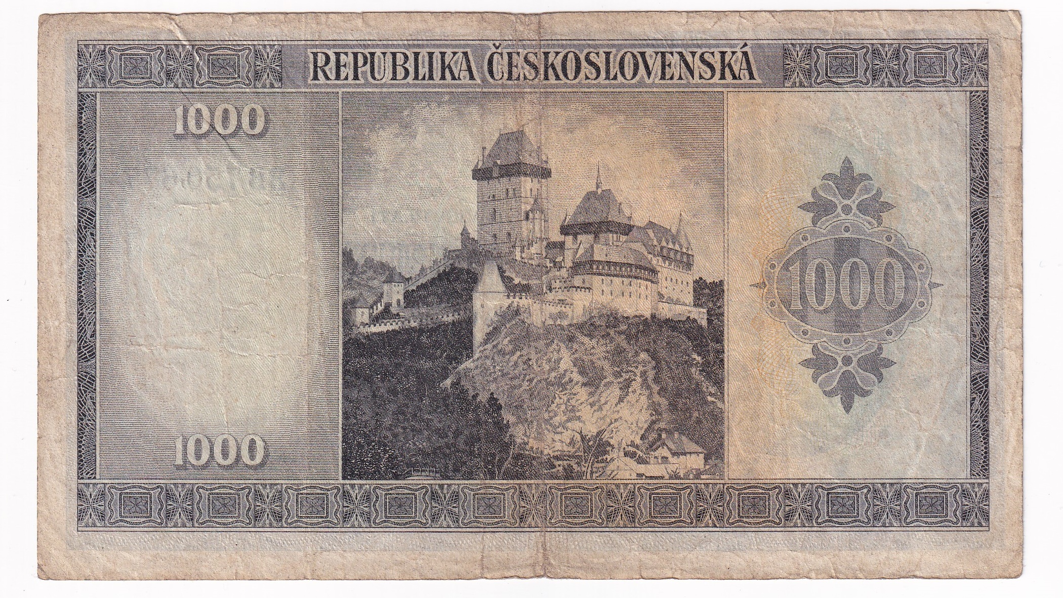 Stará, obehová bankovka Československa v hodnote 1000 Korún z roku 1945.