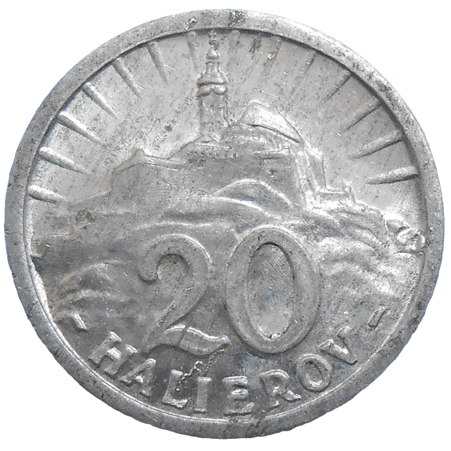 Stará, hliníková, obehová minca Slovenského štátu v hodnote 20 Halierov z roku 1943.