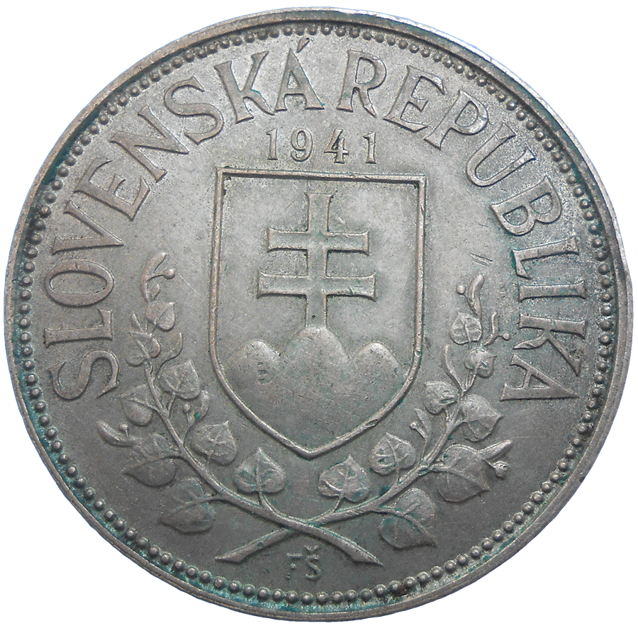 Stará, strieborná, obehová minca Slovenského štátu v hodnote 20 Korún z roku 1941.