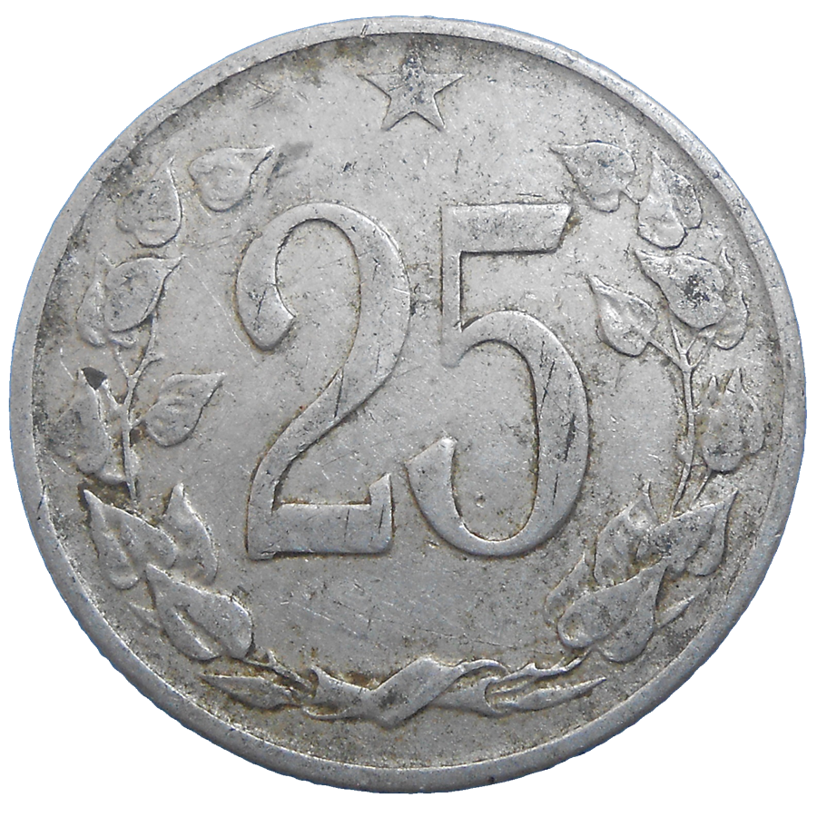 Stará, hliníková, obehová minca Československa v hodnote 25 Halierov z roku 1964.