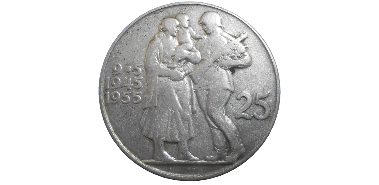 Strieborná, pamätná minca Československa v hodnote 25 Korún z roku 1955, vydaná pri príležitosti 10. výročia oslobodenia Československa.