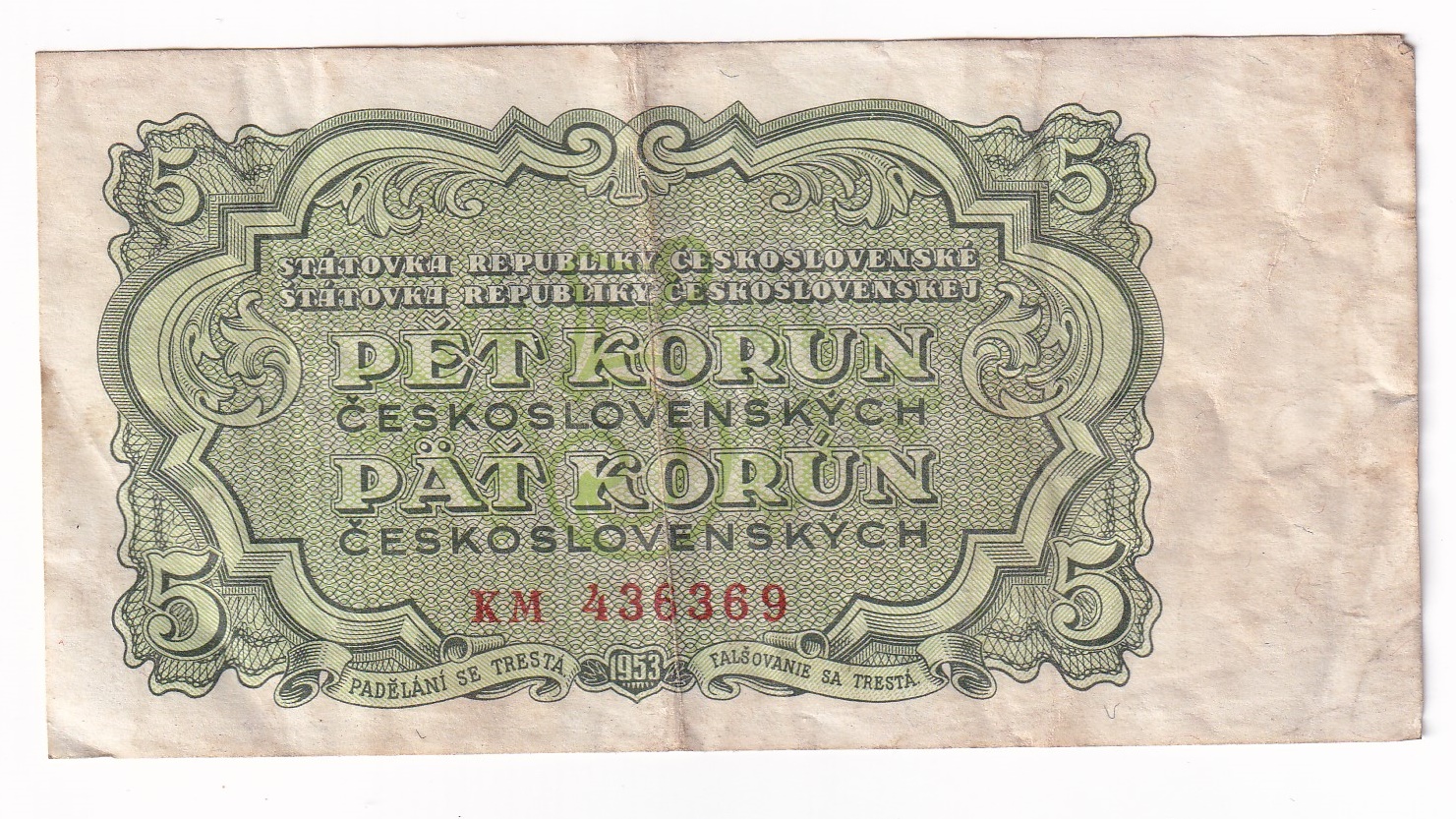 5 Korún 1953 KM. Séria KM 436369. Stará, obehová bankovka Československa v hodnote 5 korún z roku 1953 – Numizmatický obchod