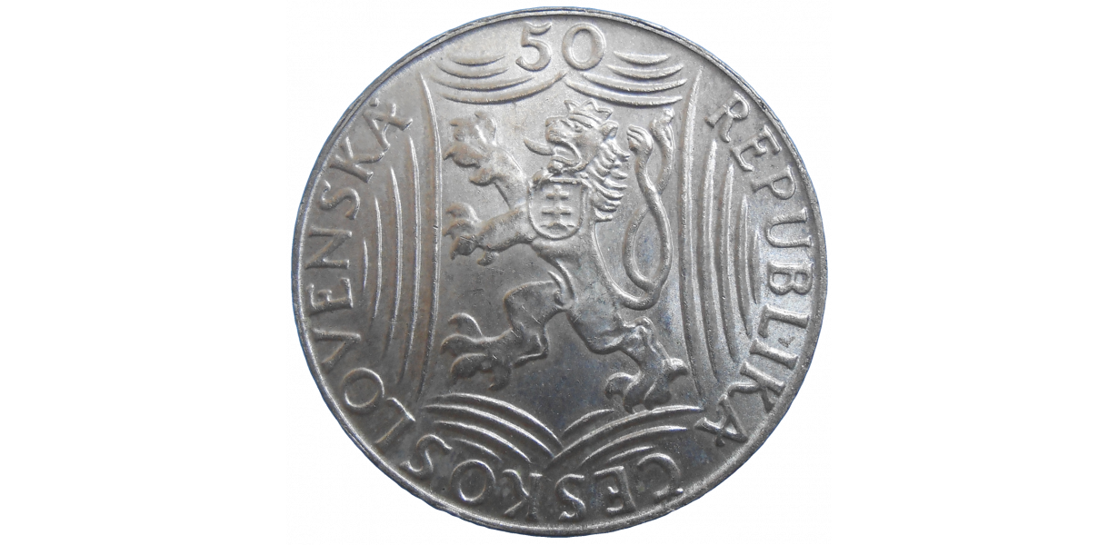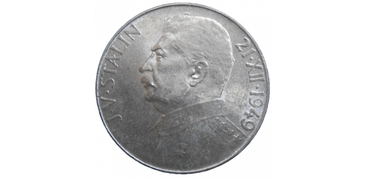 Strieborná, pamätná minca Československa v hodnote 50 Korún z roku 1949, vydaná pri príležitosti 70. výročia narodenia J. V. Stalina.