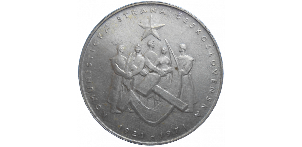 Strieborná, pamätná minca Československa v hodnote 50 Korún z roku 1971, vydaná pri príležitosti 50. výročia založenia Komunistickej Strany Československa.