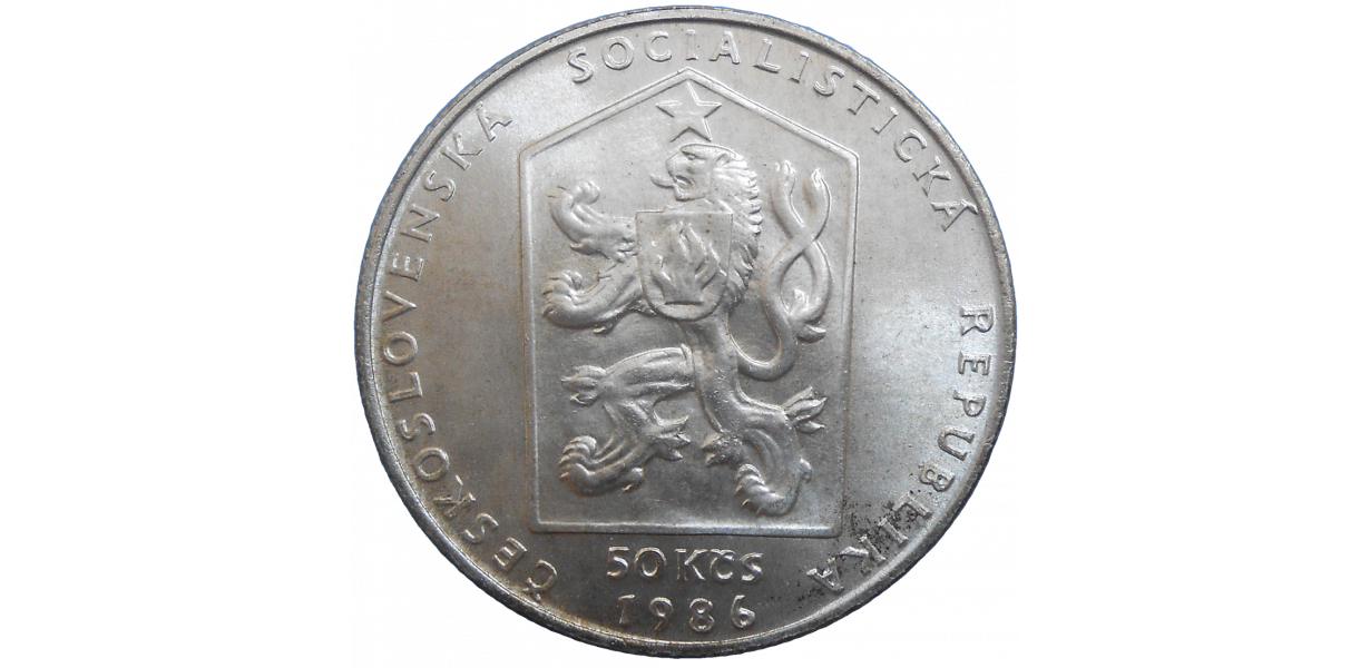 Strieborná, pamätná minca Československa v hodnote 50 Korún z roku 1986.