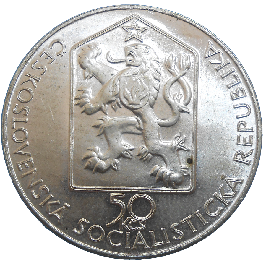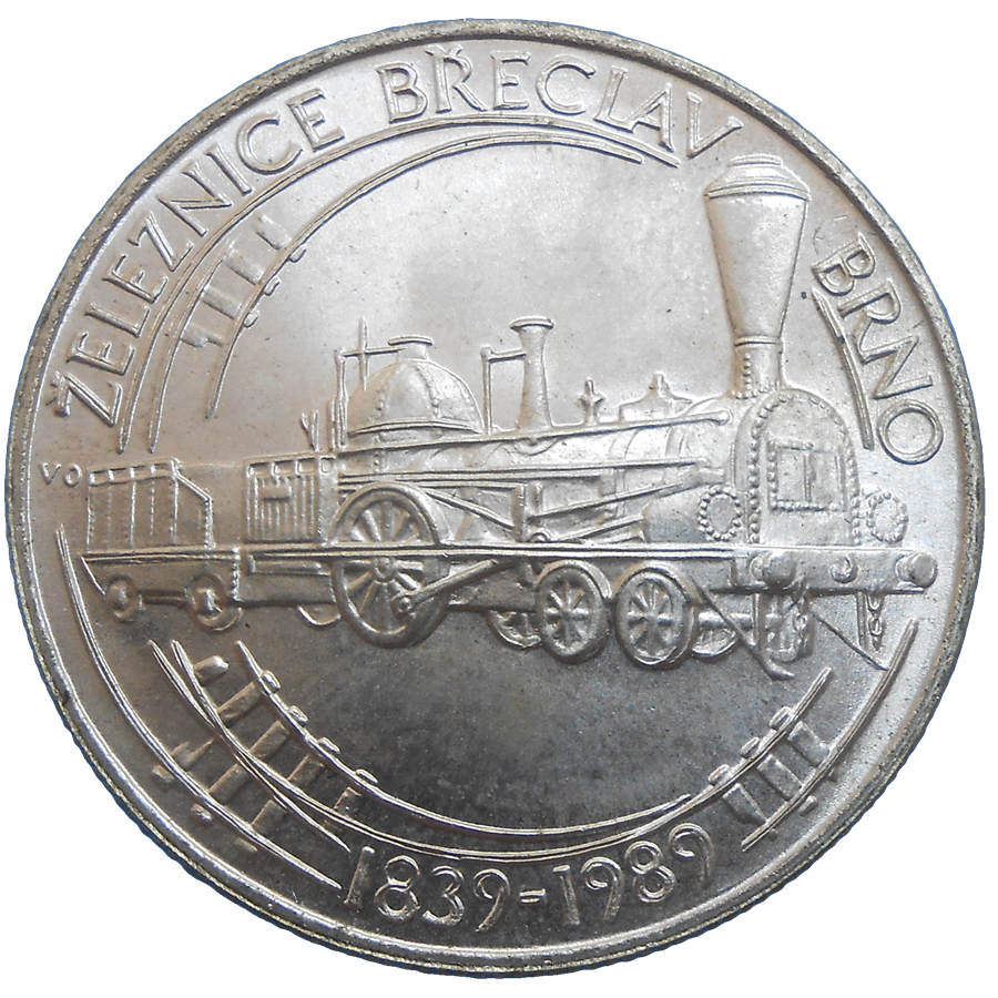 Stará, strieborná, pamätná minca Československa v hodnote 50 korún z roku 1989, vyrazená pri príležitosti 150. výročia spustenia železničnej trate Břeclav a Brno.
