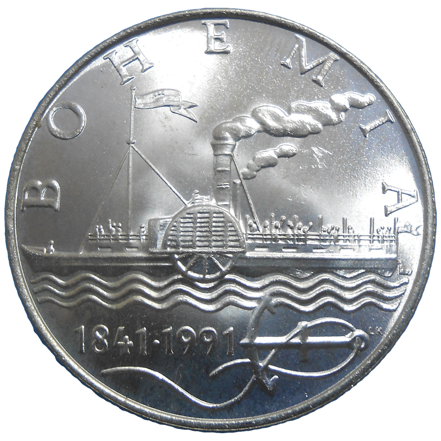 Strieborná, pamätná minca Československa v hodnote 50 Korún z roku 1991, vydaná pri príležitosti 150. výročia zahájenia plavby parníku Bohemia.