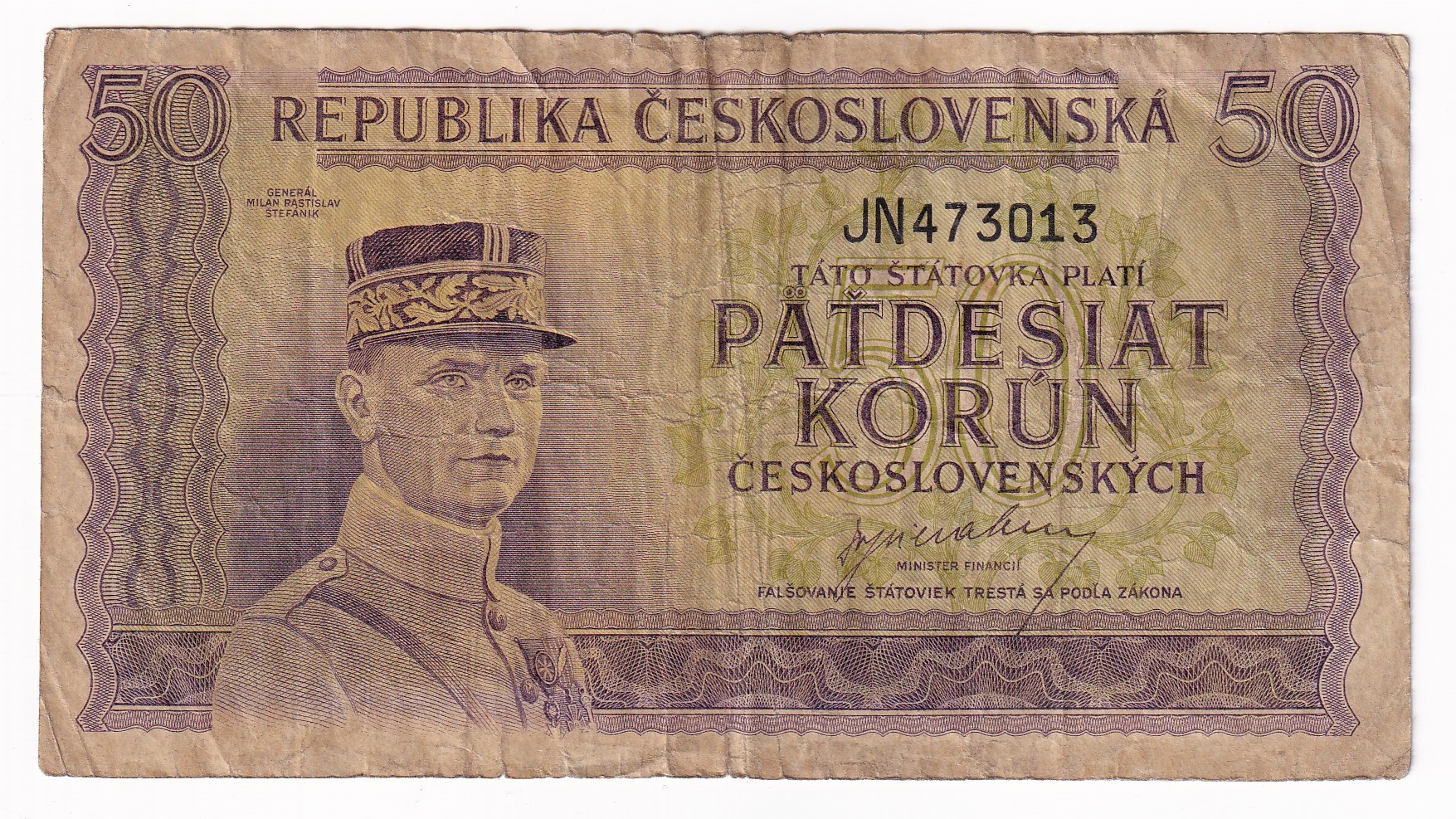 50 Korún 1945 JN. Séria JN 473013. Stará, obehová bankovka Československa v hodnote 50 korún z roku 1945 – Numizmatický obchod