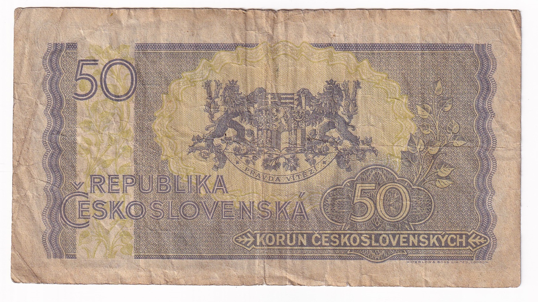 Stará, obehová bankovka Československa v hodnote 50 korún z roku 1945.