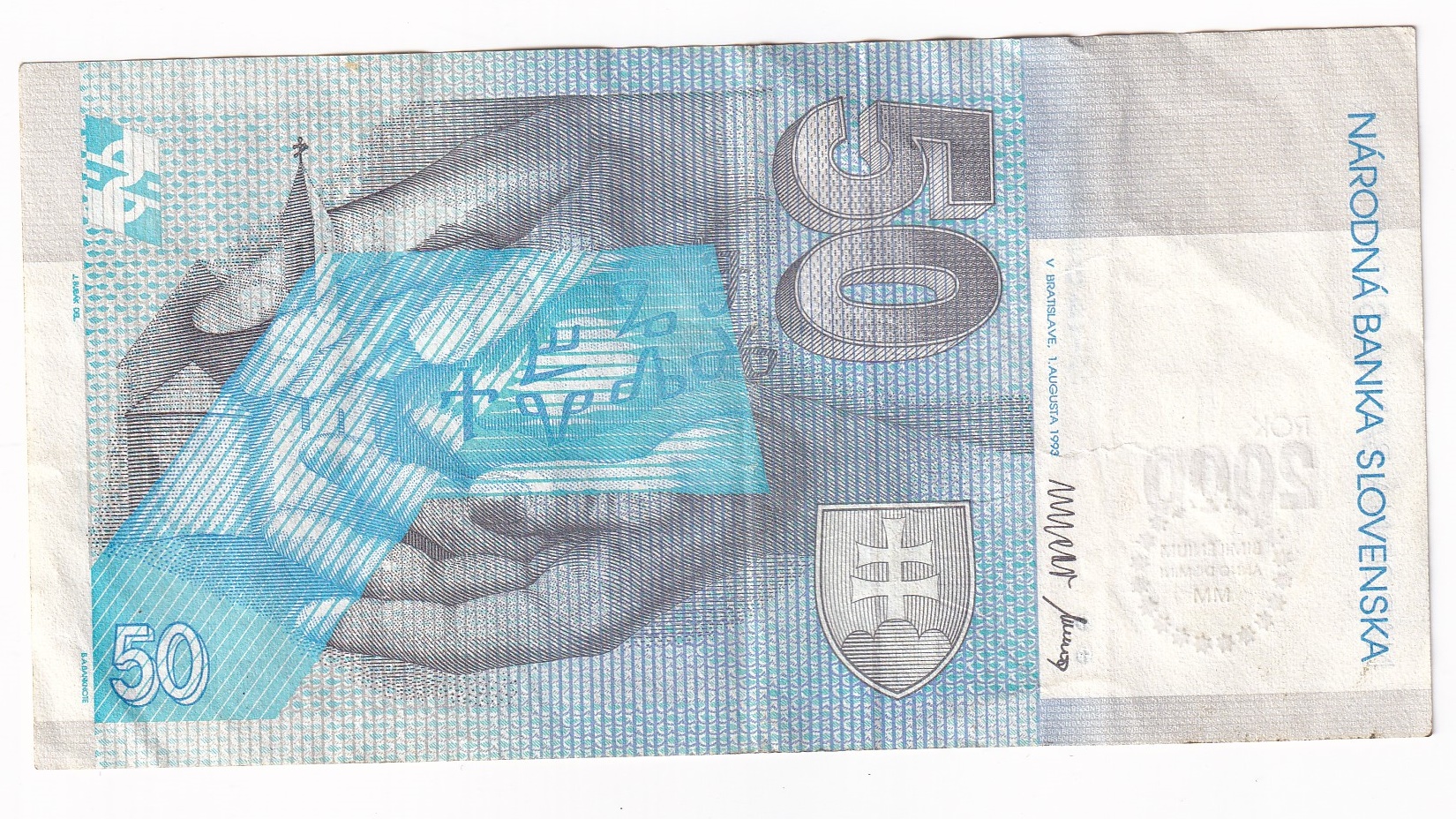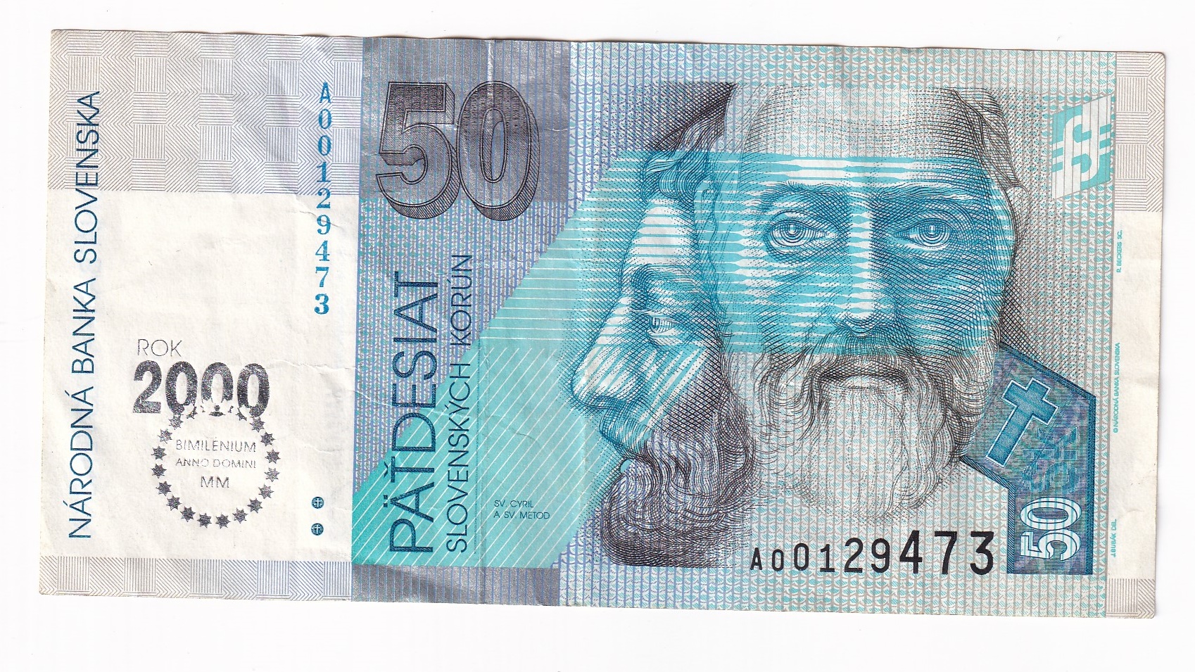 Stará, obehová bankovka Slovenskej republiky v hodnote 50 Korún z roku 1993 s pretlačou Bimilénium.