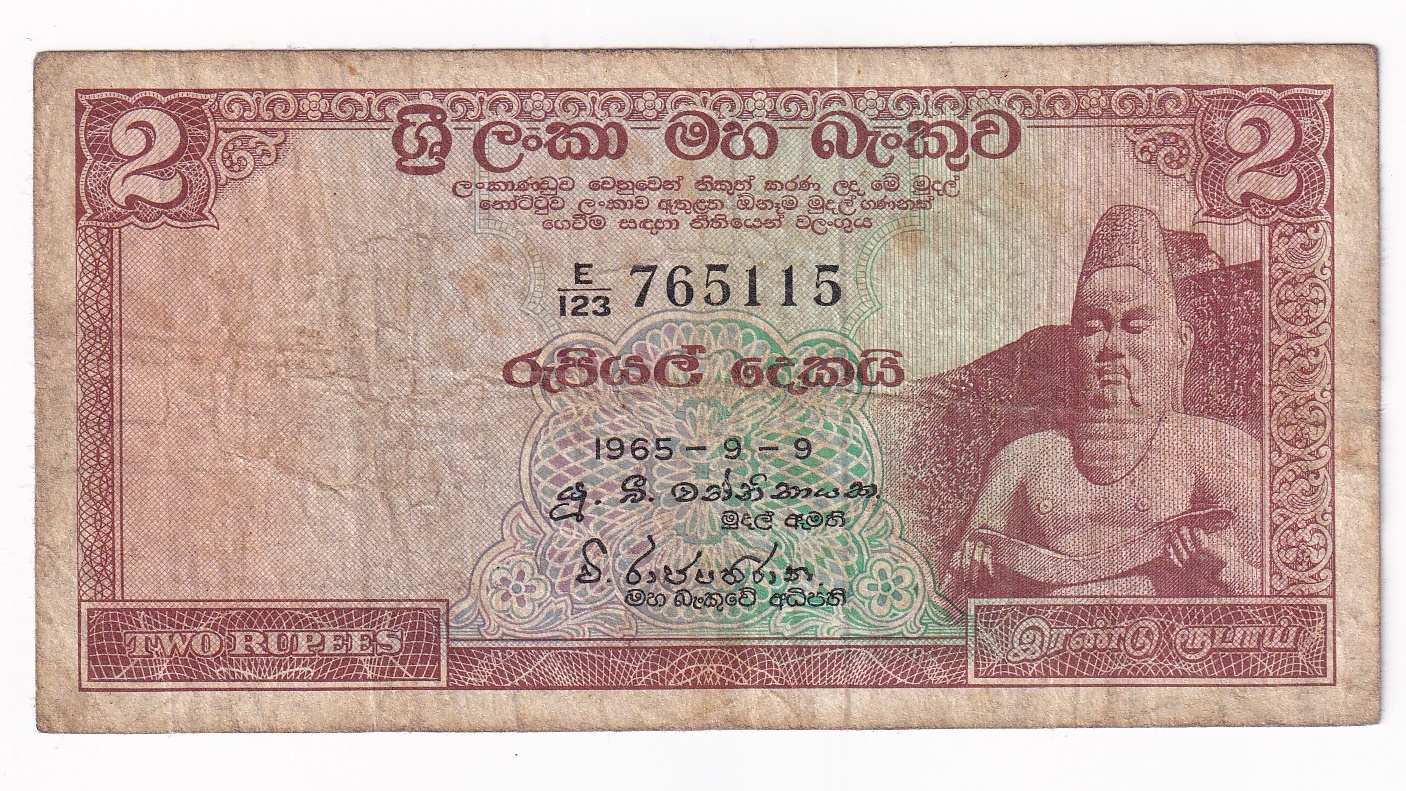 Ceylon 2 Rupees 1965. Séria E123 765115. Stará, obehová bankovka Ceylonu (Srí Lanka) v hodnote 2 Rupees z roku 1965 – Numizmatický obchod