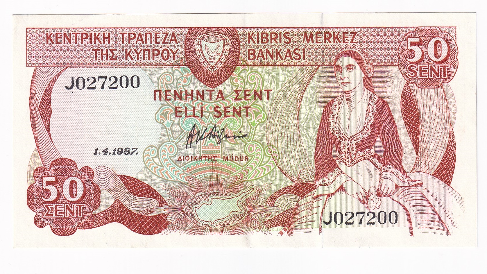 Cyprus 50 Cents 1987. Séria J 027200. Stará, obehová bankovka Cypru v hodnote 50 Centov z roku 1987 – Numizmatický obchod