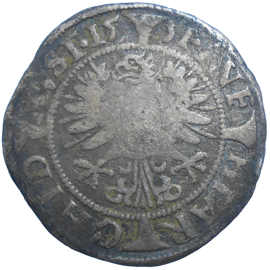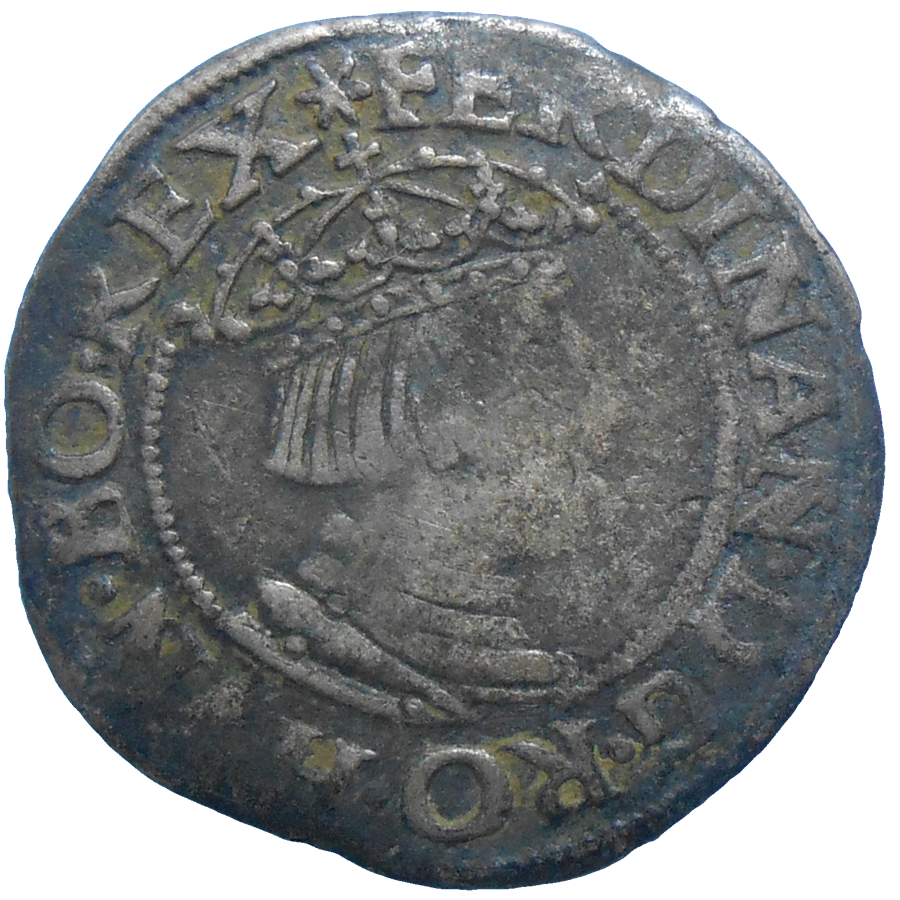 Stará, strieborná, obehová minca Ferdinanda I. Habsburského v hodnote 3 grajciarov z roku 1551.