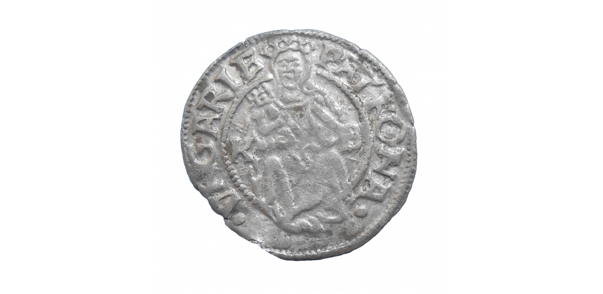 Stará, strieborná, obehová minca Ferdinanda I. Habsburského v hodnote denáru z roku 1528.