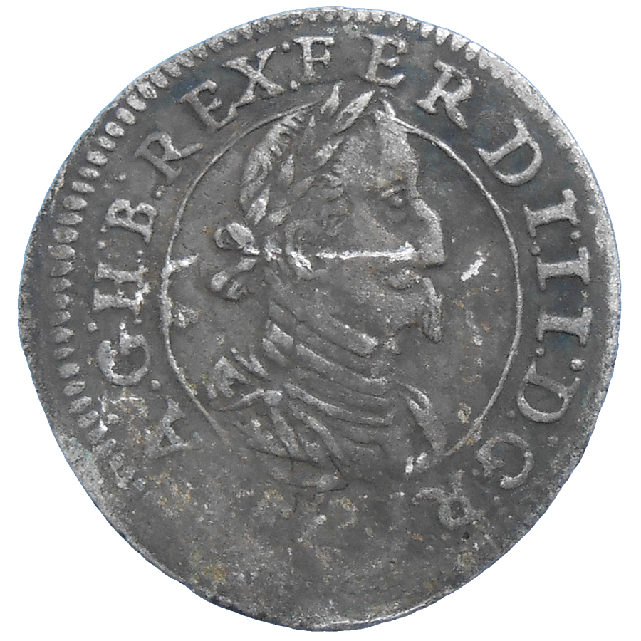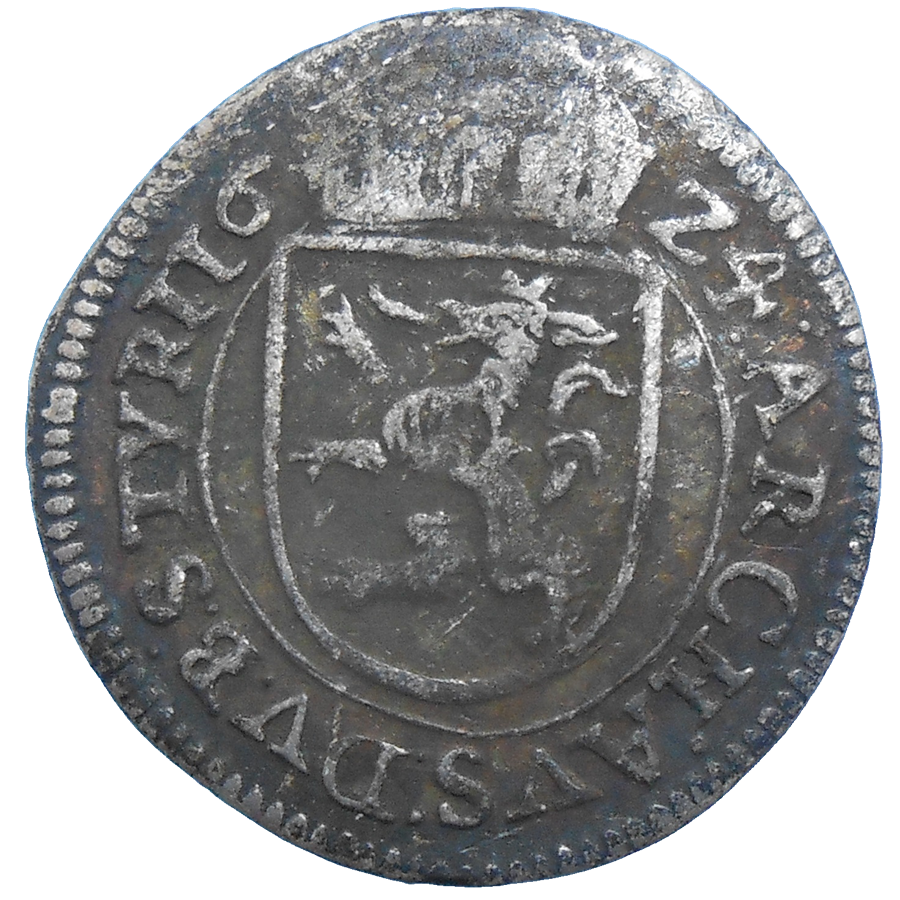Stará ,strieborná, obehová minca Ferdinanda II. Habsburského v hodnote 2 grajciarov z roku 1624.