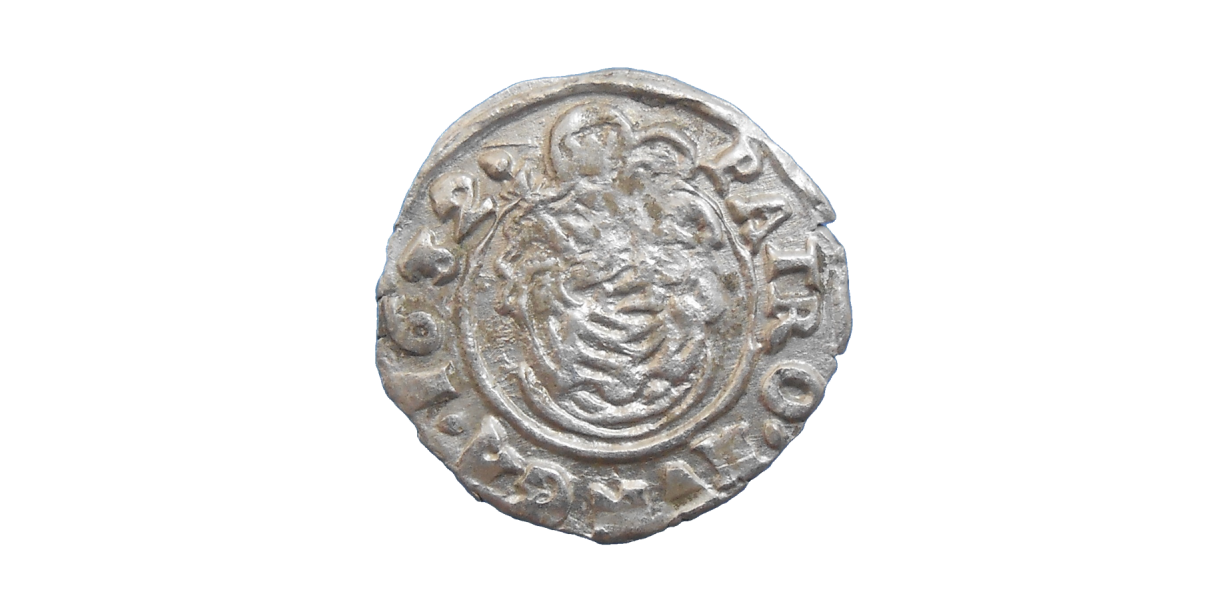 Stará, strieborná, obehová minca Ferdinanda II. Habsburského v hodnote denáru z roku 1632.