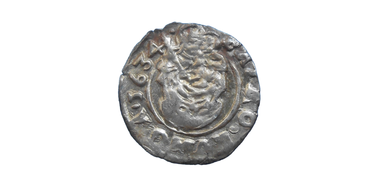 Stará, strieborná, obehová minca Ferdinanda II. Habsburského v hodnote denáru z roku 1634.