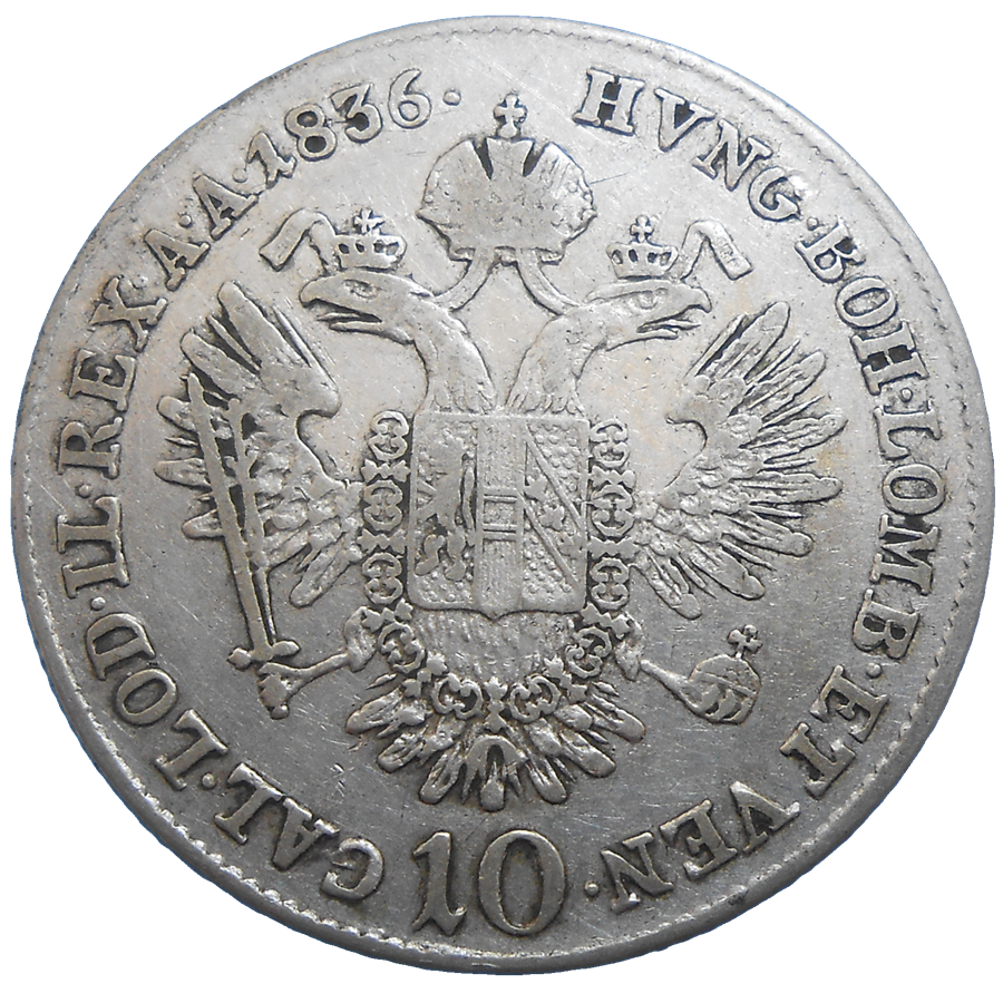 Stará, strieborná, obehová minca Ferdinanda V. v hodnote 10 grajciaru z roku 1836.