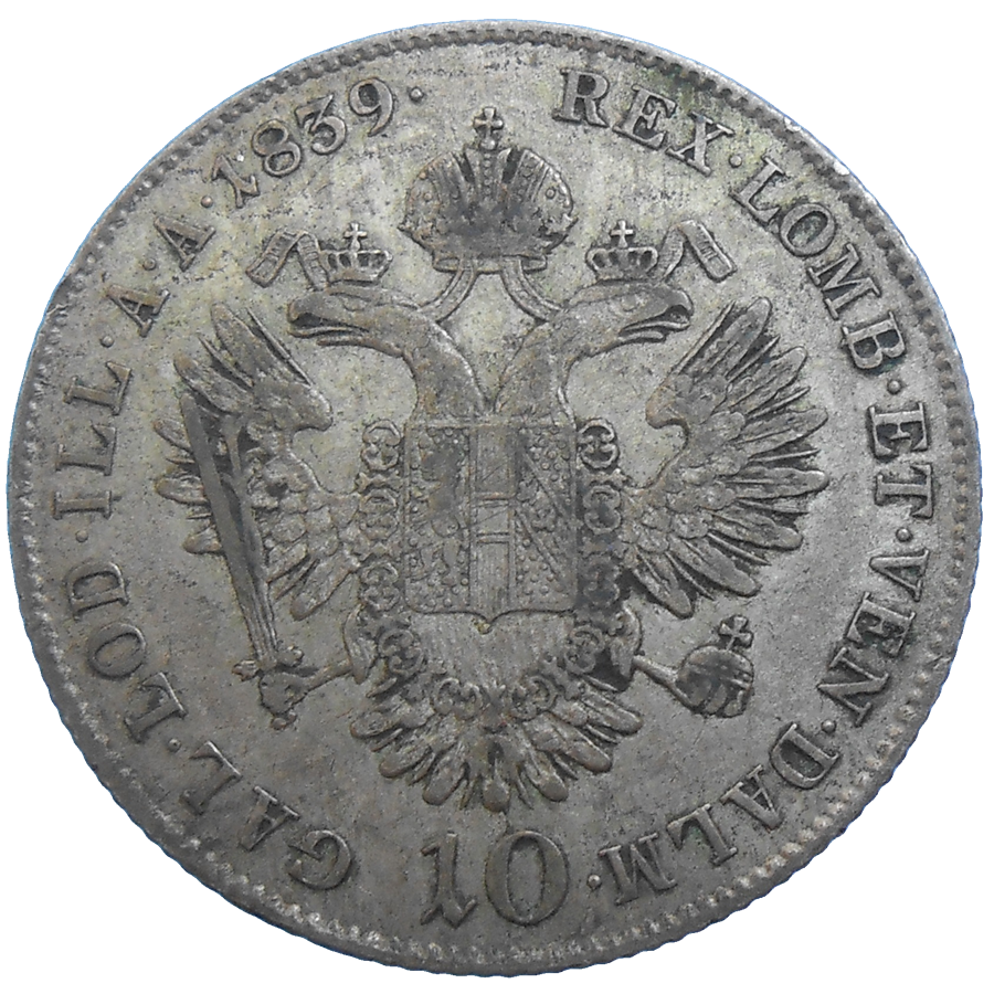 Stará, strieborná, obehová minca Ferdinanda V. v hodnote 10 grajciaru z roku 1839.
