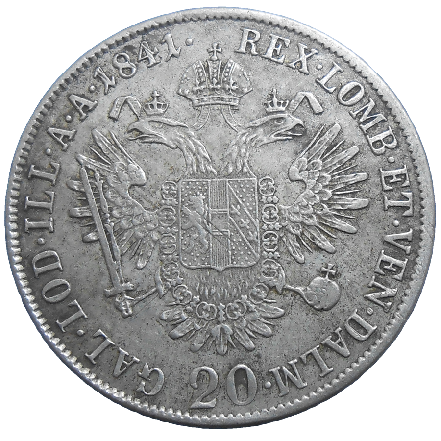 Stará, strieborná, obehová minca Ferdinanda V. v hodnote 20 grajciaru z roku 1841.