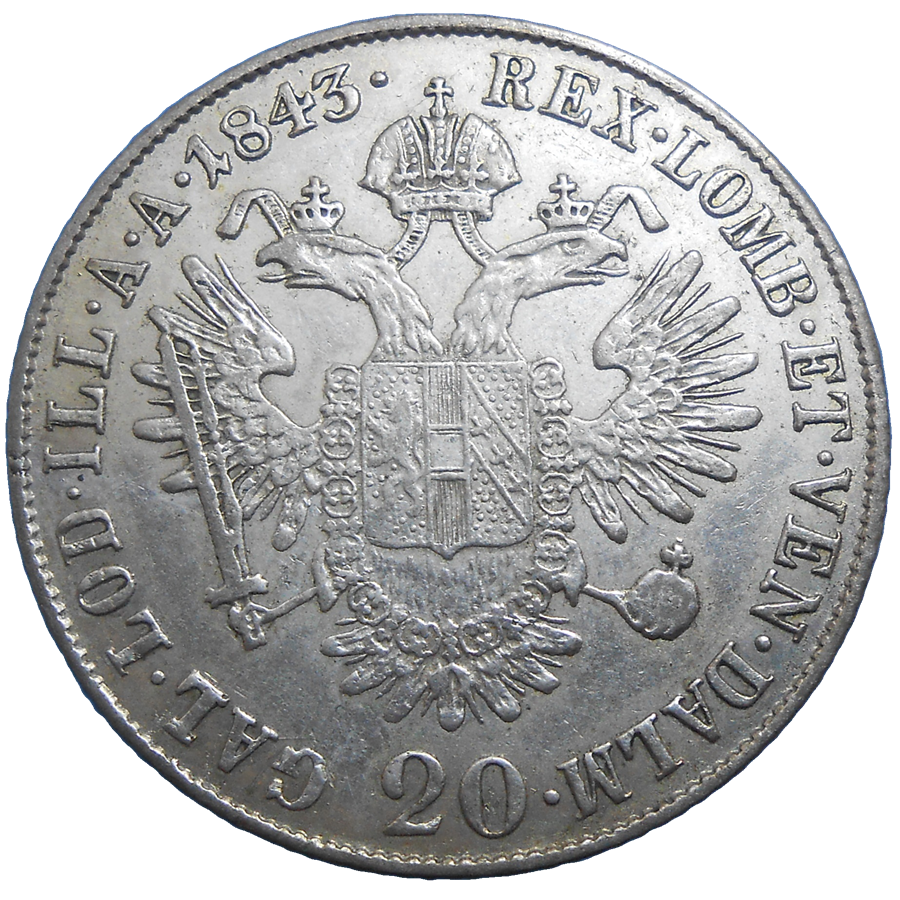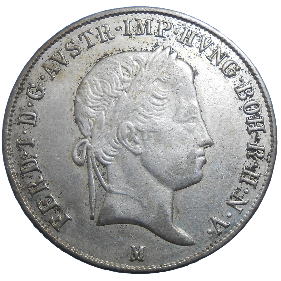 Ferdinand V. 20 grajciar 1843 M. Stará, strieborná, obehová minca Ferdinanda V. v hodnote 20 grajciaru z roku 1843 – Numizmatický obchod