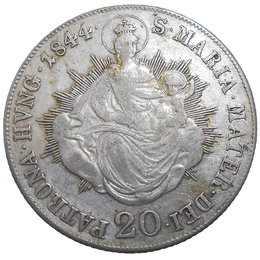 Stará, strieborná, obehová minca Ferdinanda V. v hodnote 20 grajciaru z roku 1844.