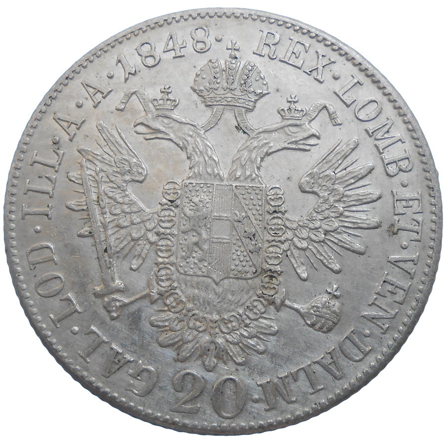 Stará, strieborná, obehová minca Ferdinanda V. v hodnote 20 grajciaru z roku 1848.