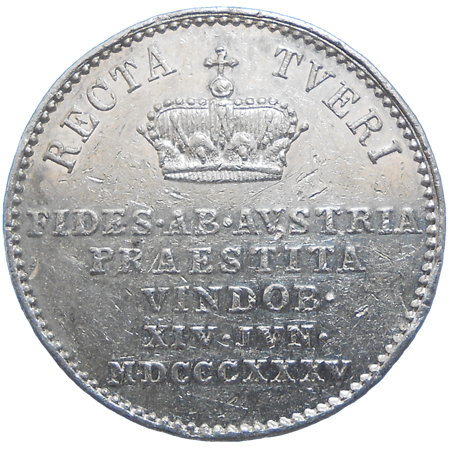 Strieborný, korunovačný žetón Ferdinanda V. z roku 1835, vyrazený pri príležitosti korunovácie Ferdinanda za rakúskeho cisára.