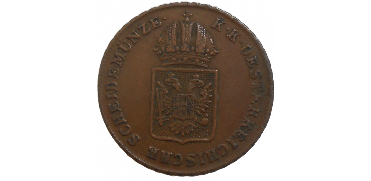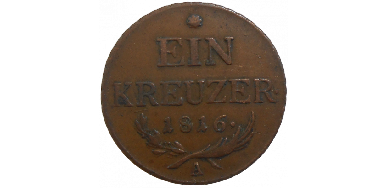 Stará, obehová medená minca Františka II. v hodnote 1 grajciaru z roku 1816.