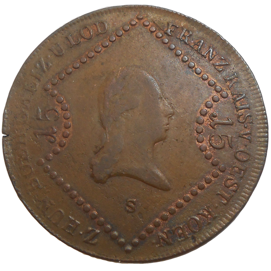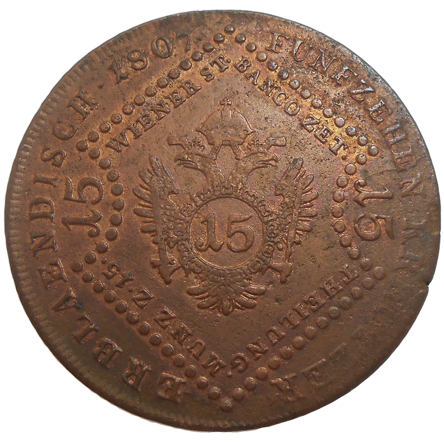 Stará, medená, obehová minca Františka II. v hodnote 15 grajciarov z roku 1807.