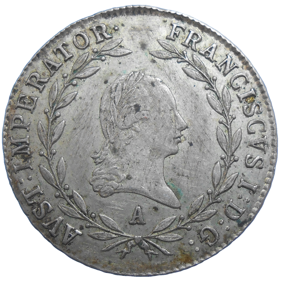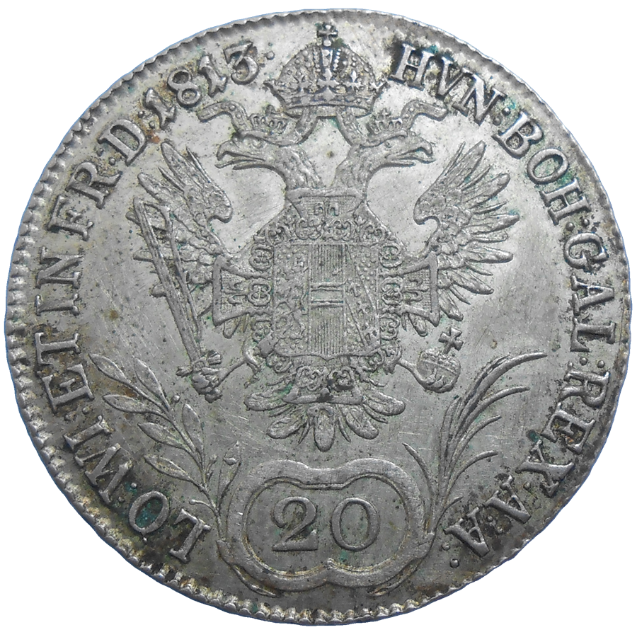 Stará, strieborná, obehová minca Františka II. v hodnote 20 grajciarov z roku 1813.