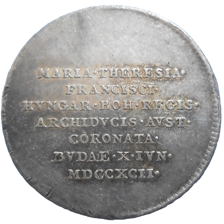 Starý, strieborný, korunovačný žetón Márie Terézie Neapolskej za uhorskú kráľovnú v Budíne v roku 1792.