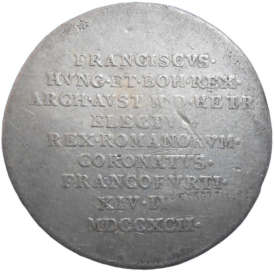 Starý, strieborný, korunovačný žetón Františka II. vyrazený pri príležitosti korunovácie za rímsko-nemeckého kráľa v roku 1792.