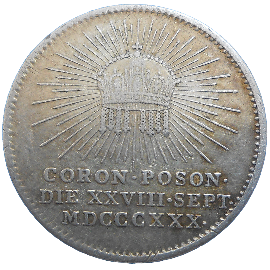 Starý, strieborný, korunovačný žetón Františka II. a Ferdinanda V., vyrazený pri príležitosti korunovácie Ferdinanda V. za uhorského kráľa v Bratislave.