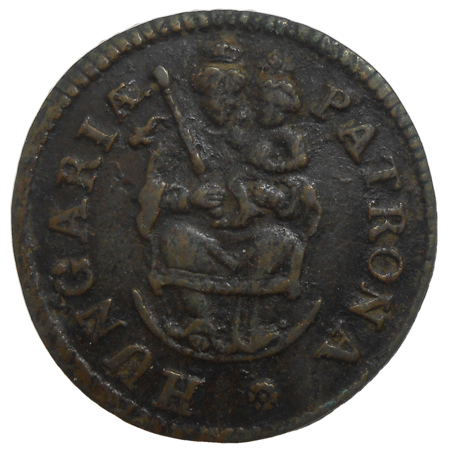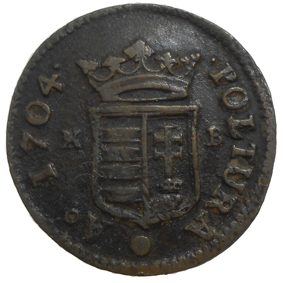 Stará, medená, obehová minca Františka II. Rákociho v hodnote poltury z roku 1704.