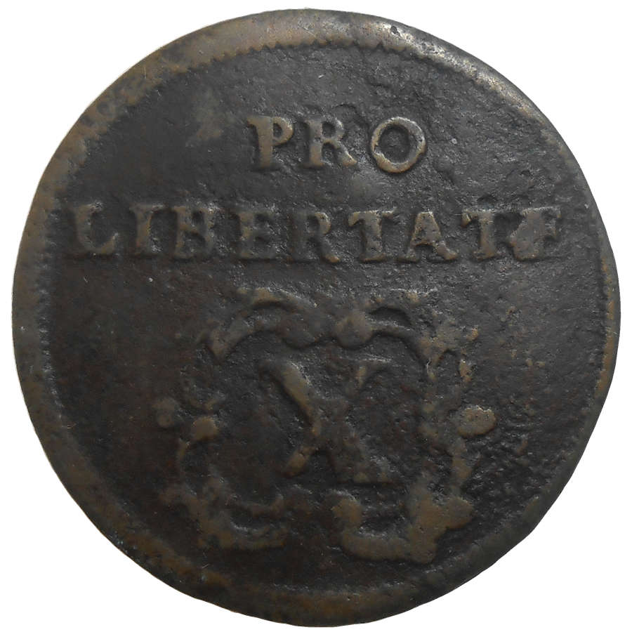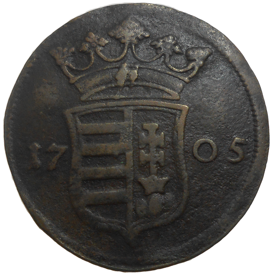 Stará, medená, obehová minca Františka II. Rákociho v hodnote X poltury z roku 1705.