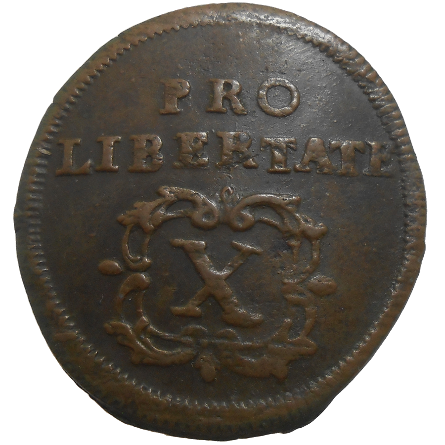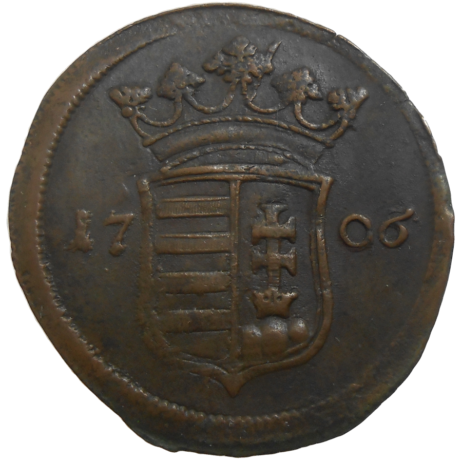 Stará, medená, obehová minca Františka II. Rákociho v hodnote X poltury z roku 1706.