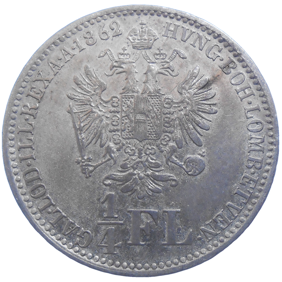 Stará, strieborná, obehová minca Františka Jozefa I. v hodnote 1/4 zlatníku z roku 1862.