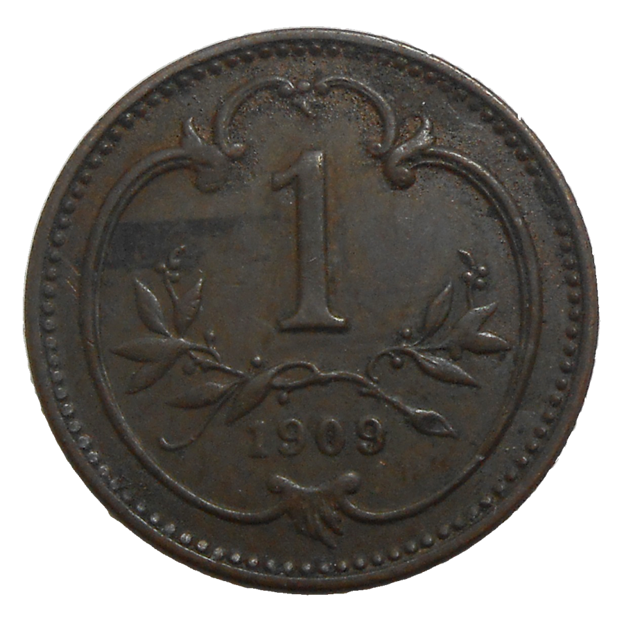 Stará, obehová minca Františka Jozefa I. v hodnote 1 Heller z roku 1909.